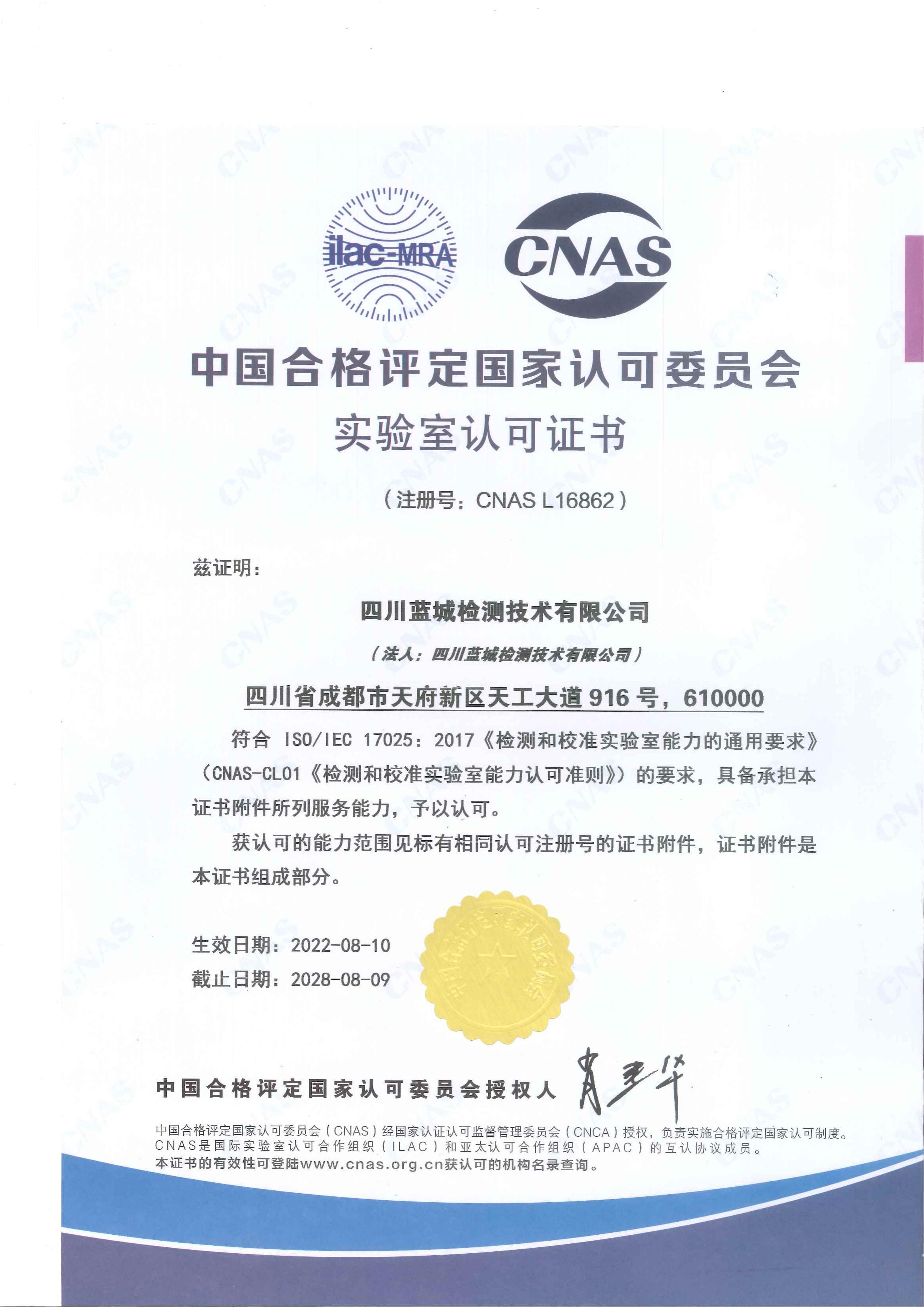 实验室认可证书CNAS